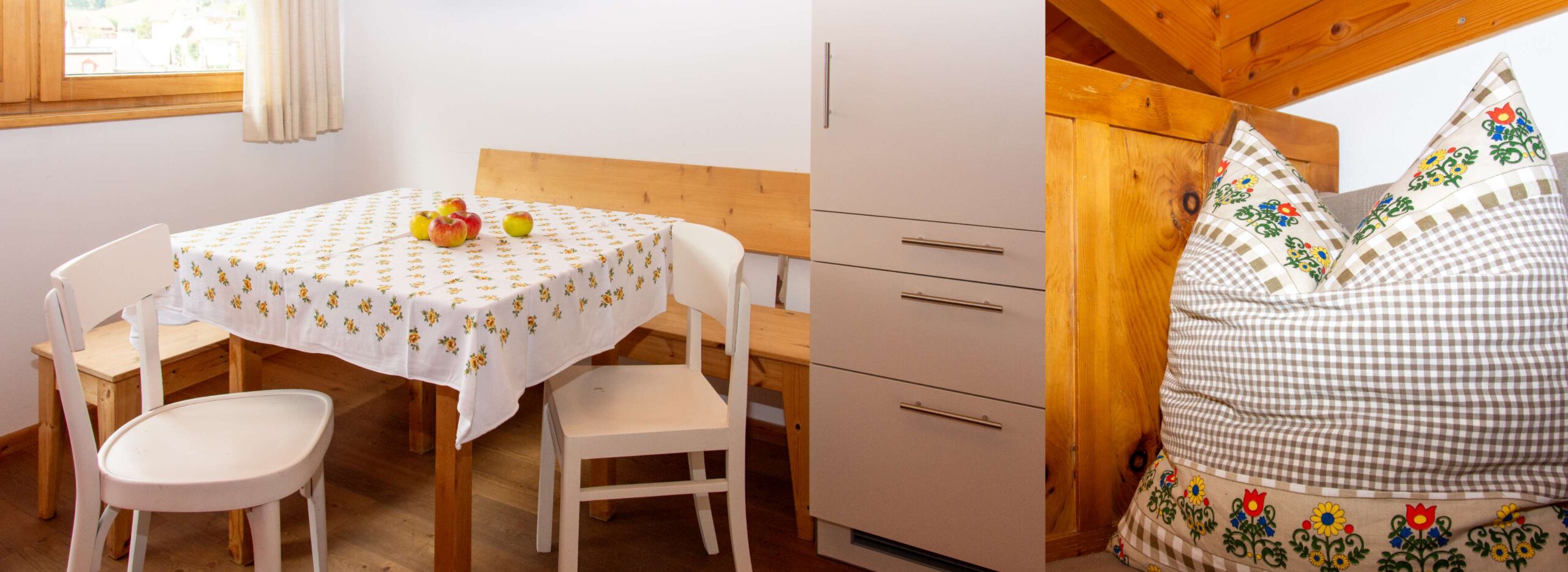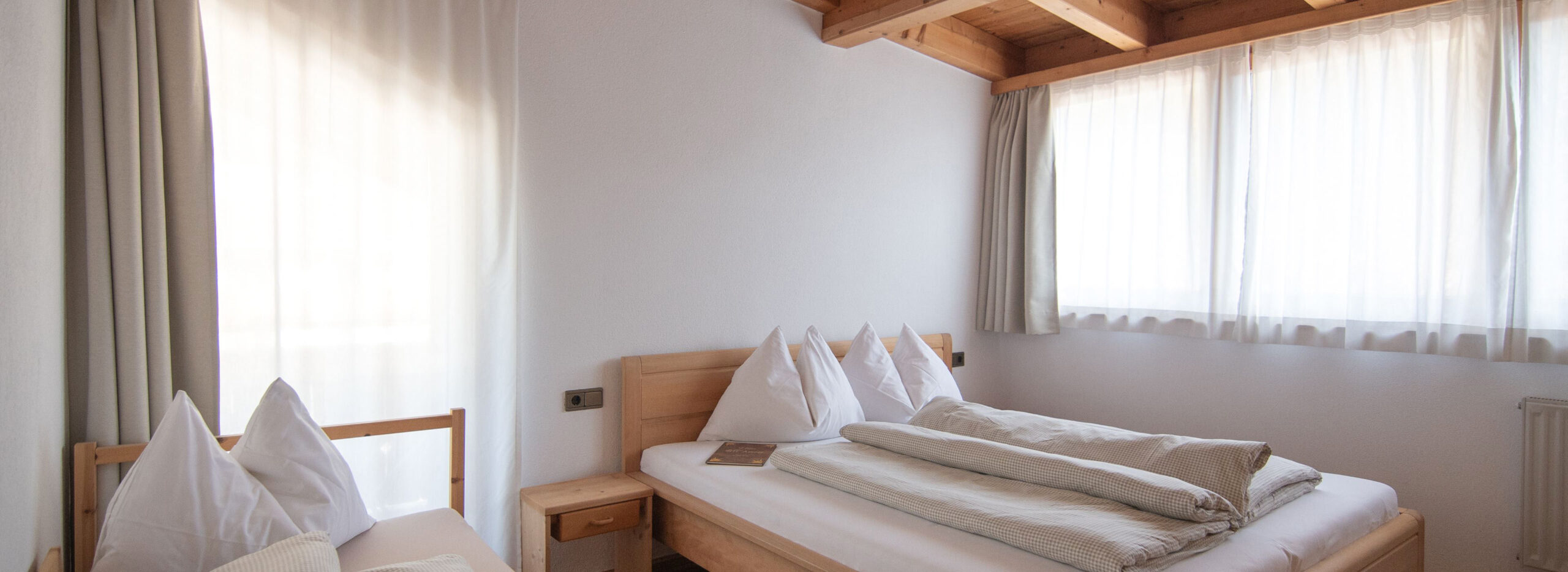 Arrivare e sentirsi a casa: Nei nostri appartamenti per 2-4 persone vi potete rilassare e godervi la vista sulle montagne e sulle cime dolomitiche. Le camere sono dotate di letti in legno massiccio locale. Le strutture semplici e lineari delle stanze trasmettono un senso di quiete e benessere.